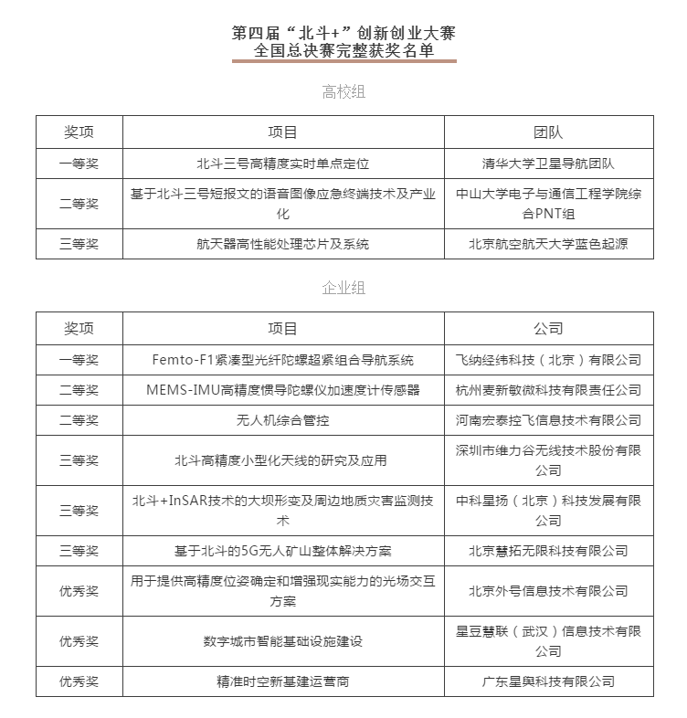 最终来自清华大学卫星导航团队的北斗三号高精度实时单点定位获得高校组一等奖;飞纳经纬科技(北京)有限公司的Femto-F1紧凑型光纤陀螺超紧组合导航系统项目获得企业组一等奖。