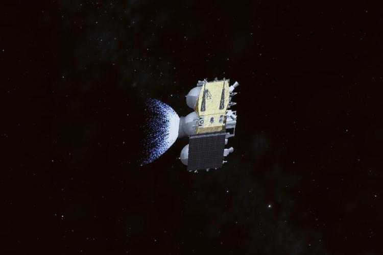 This image taken from video animation at Beijing Aerospace Control Center (BACC) on June 4, 2024 shows the ascender of China's Chang'e-6 probe, carrying samples collected from the moon's far side, lifting off from lunar surface. (Xinhua/Jin Liwang)