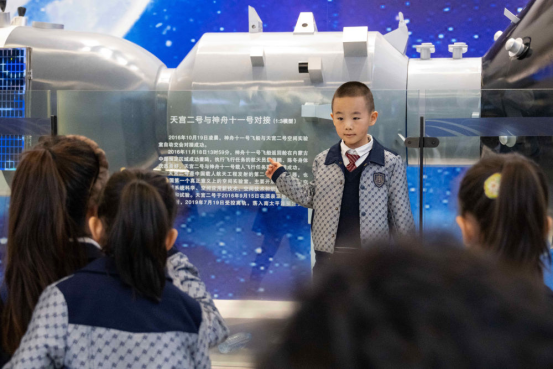 4月23日,在哈尔滨工业大学航天馆,小朋友在天宫二号与神舟十一号对接模型前留影。