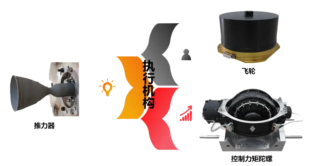 执行机构就像是卫星的“手脚”,根据控制器传递过来的指令信息执行、输出相应的力矩,从而改变卫星的姿态。常见的执行机构有飞轮、控制力矩陀螺、推力器等,其中飞轮、控制力矩陀螺通过角动量交换的原理改变卫星的角速度,推力器通过施加不通过质心的力而产生力矩。
