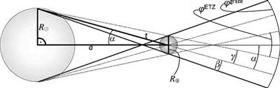 地球凌日区的结构示意图。左侧圆形区域代表太阳,而右侧区域代表地球(未按大小比例)。
