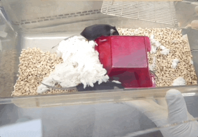第二窝小鼠明显更放松不再把棉花全拖进红房子愿意主动出来探索、跑动
