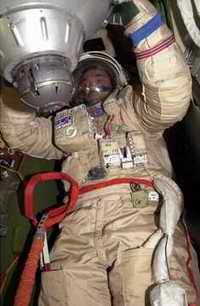 舱内航天服相对比较简单一点,是航天员在座舱内使用的服装。它由头盔、压力服、通风和供氧软管、可脱戴的手套、靴子和一些附件组成。航天服中的各部分既要气密性好,加压时气体不会泄漏,又要不影响航天员的活动。通风供氧管与舱内的通风供氧装置相连,正常情况下,可以给航天服通风,以散去航天员发出的热量。当座舱中的压力突然变化时,给服装通风的风机就会关闭,使航天服中处于密闭供氧状态。舱内航天服的穿脱比较方便,正常情况下航天员在舱内是不穿此服装的,只是当舱内压力突然变化时,航天员才迅速穿上此服装,以保证航天员的安全。