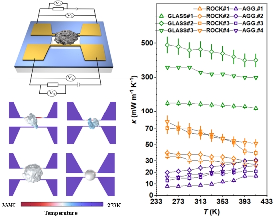 图3 悬臂式H型微纳热桥测试方法和月壤颗粒的本征热导率测试结果