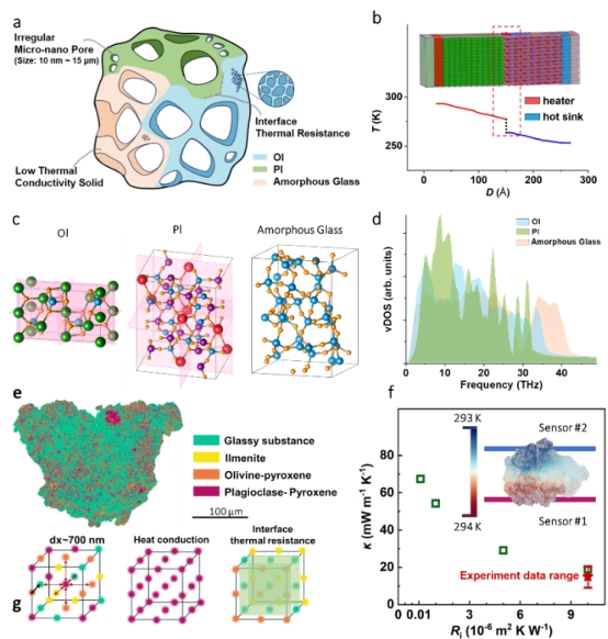 微观结构和矿物组分分析进一步揭示了胶结物超低热导率的物理机制。胶结物颗粒由非晶态熔融玻璃胶结多种矿物碎屑构成,内部高度不规则,并分布着纳米至微米尺度的多级孔隙网络。这种复合结构显著增强了声子散射与界面热阻,延长了热流路径,从而有效抑制热传导。进一步对比发现,胶结物颗粒的热导率并不单单取决于孔隙率,而更依赖于孔隙连通性及结构复杂度。具有更复杂物相界面和连通孔结构的颗粒,即使孔隙率较低,也表现出更低的热导率。分子动力学(MD)模拟结果表明,不同矿物相(如斜长石、橄榄石)与玻璃相之间存在显著的振动态不匹配,导致界面处声子传输效率降低。定量分析显示,理想晶体-晶体界面的热阻约为10-8 m2·K·W-1,而考虑纳米孔隙、缺陷及热流路径弯曲后,其等效界面热阻可提升至约10-5 m2·K·W-1。这一数量级的跃升,充分说明了微观结构与缺陷在抑制热传导中的主导作用。相较于理想致密矿物,具有多尺度孔隙与复杂界面的胶结物,其热导率降至晶体传热水平的约12%。研究团队进一步构建了从微观结构到介观热导率的跨尺度模型。通过将界面热阻及含缺陷矿物相的热导率引入有限差分模拟,验证了复杂界面结构、多尺度孔洞与缺陷在整体热传导中的控制地位。值得指出的是,真实月表环境中还存在太阳风辐照、电荷积累及其他物理-化学耦合作用,这些因素对颗粒热传导行为的进一步影响仍有待探索。